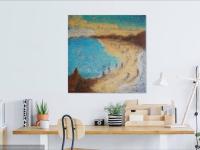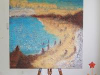 Abstract seaside oil painting of Singapore east coast parkway beach in dreamy blue yellow hues, impasto textural original art of my favourite landscape in the world.